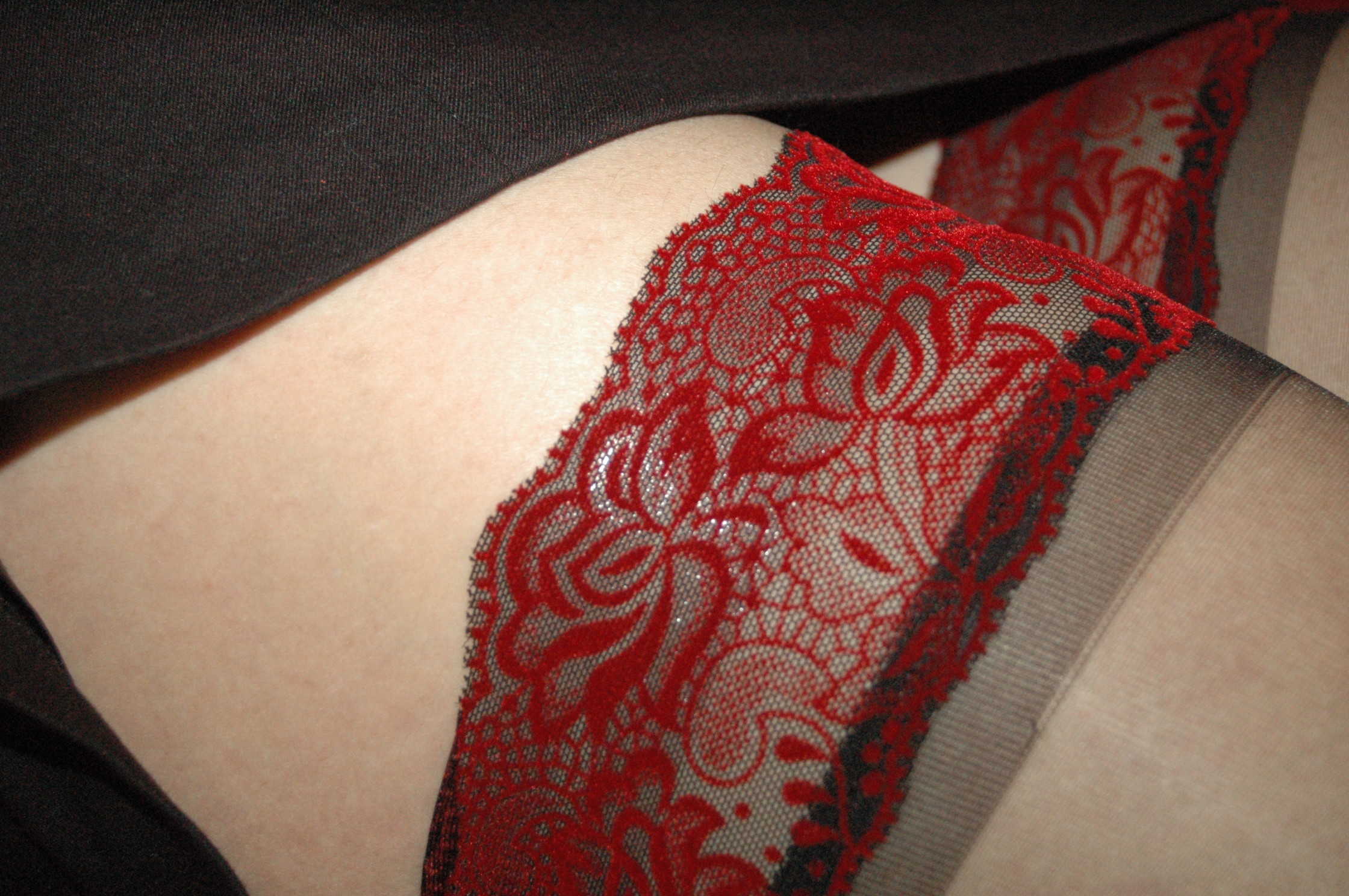 Falls ich mal romantische Anfälle habe, sind die Nadjas eindeutig favourites :-). Die roten Blümchen auf der Bordüre sind ganz weich und samtig und verleiten zum Angreifen. Die Strümpfe selbst sind weich und haben trotzdem diesen feinen Nylon-Look. Bei der Größe passt 1/2 zwar auch auf meine Oberschenkel ohne Zwicken, aber mit 3/4 bin ich auf der sicheren Seite und die Nadjas gehen so hoch hinauf, wie ich es gern hab ;-).