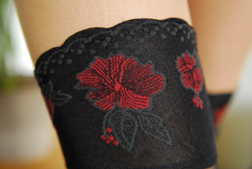 Wenn schon Blümchen, dann solche! Die Blümchenbordüre ist nicht, wie bei vielen Strümpfen (und oft schlampig) angenäht, sondern direkt mitgewebt – und die Farbkombination macht schon was her! Bei der Größe brauch ich hier M/L, weil die Calze Nadjas (mit dem relativ breiten Abschluss) nicht besonders hoch rauf gehen, leider. Der einzige Wermutstropfen :-(. Das Material wie bei allen Veneziana-Strümpfen fein, weich und trotzdem glatt anzugreifen.