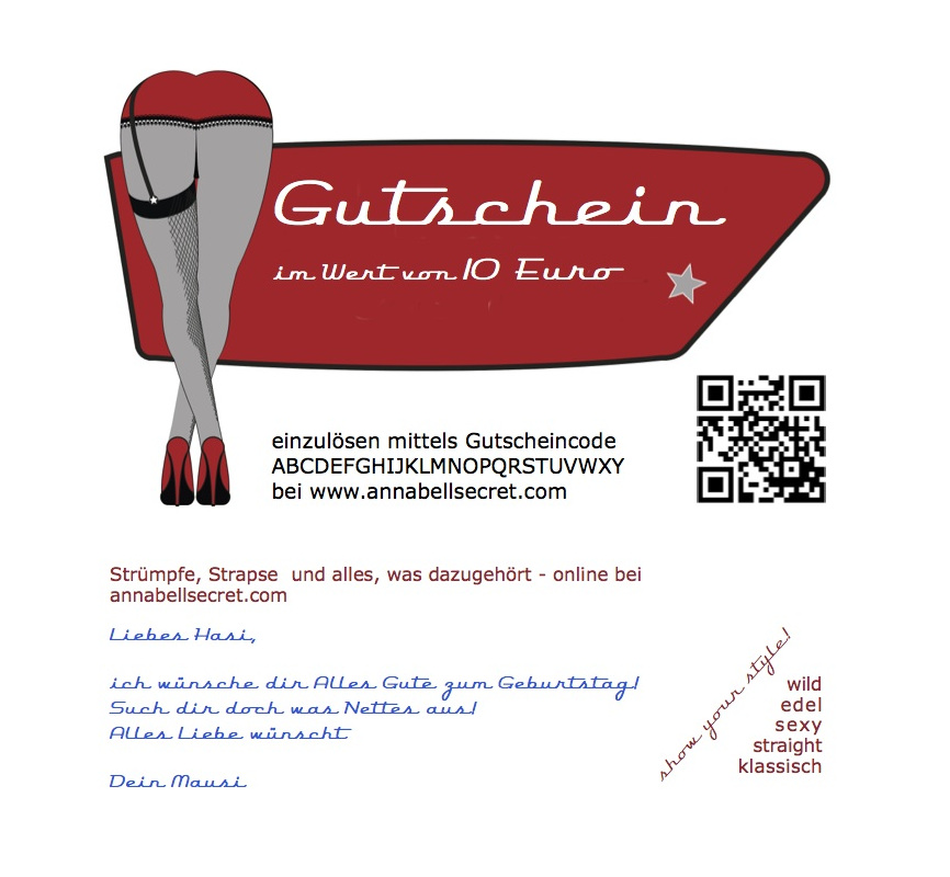 Geburtstage, Jahrestage, einfach so…. gute Gelegenheiten für ein nettes Geschenk gibt es doch immer wieder :-). Mit einem Gutschein von Annabellsecret gibst du zwar „die Richtung“ vor – überlässt die Auswahl aber der/dem Beschenkten. Wenn du möchtest, kannst du das Geschenk auch mit einer Grußbotschaft versehen „direkt“ zustellen lassen (es muss ja nicht unbedingt von Hasi an Mausi sein- den gewünschten Text einfach bei der Bestellung angeben).