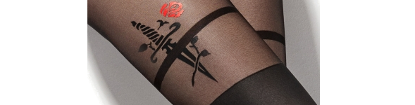 Weiche, glatte Mikrofaserstrumpfhose (60den) – ab overknee 20den. Messer und Rose unter dem Strumpfband sind aufgedruckt.